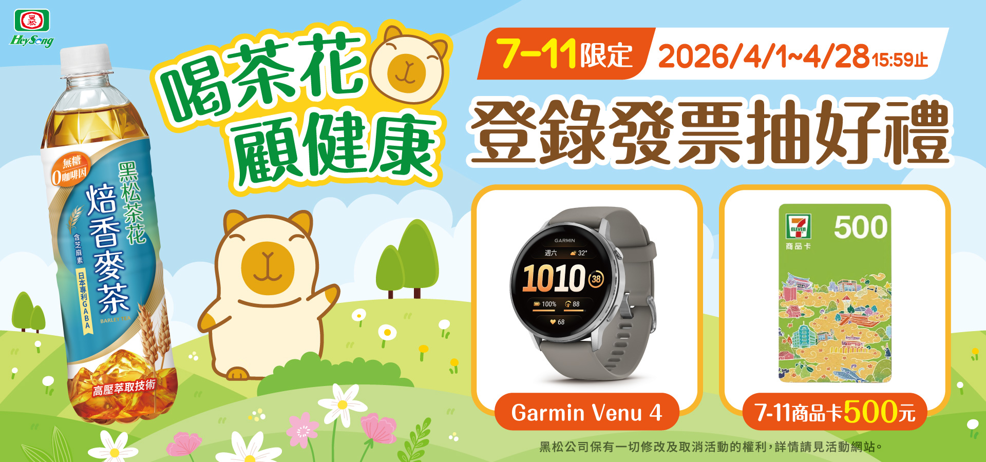 指定通路登錄發票抽:自2026/04/01 (三) 00:00 至 2026/04/28 (二) 15:59止,至「7-ELEVEN」購買黑松茶花「喝茶花顧健康」活動商品任乙瓶 (PET580mL黑松茶花焙香麥茶),於活動官網以LINE帳號綁定黑松會員,並登錄【購買發票號碼】即可抽指定通路獨家贈品!